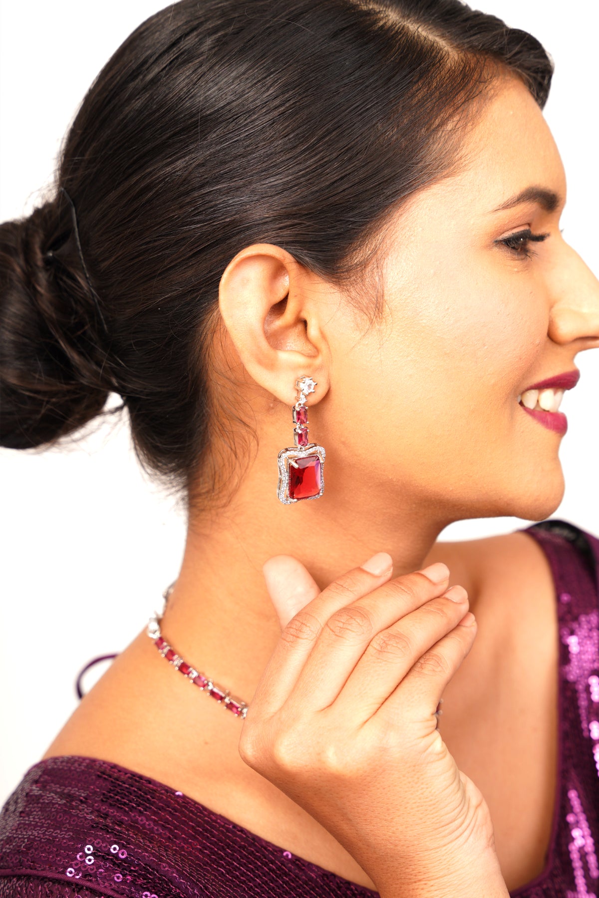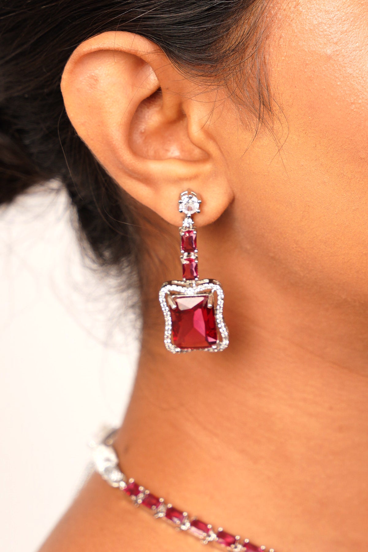 - Description: Ruhana is a majestic Victorian-inspired jewelry set crafted in a white-silver finish. The necklace features a bold, deep red central stone pendant that exudes royal grandeur, perfectly paired with red stone-studded earrings. A blend of vintage elegance and powerful femininity, this set is designed to turn heads at every occasion.